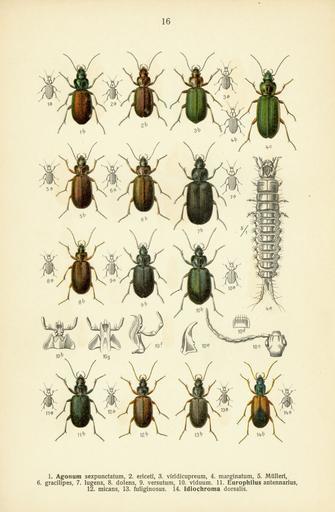 Keywords: Reitter-1908 table16.jpg See image for index to numbers Agonum sexpunctatum <small>L </small> Agonum sexpunctatum <small> Linnaeus 1758 </small> 1<sup>a</sup> size comparison 1<sup>b</sup> adult dorsal view Agonum ericeti <small>Panz </small> Agonum ericeti <small> Panzer 1809 </small> 2<sup>a</sup> size comparison 2<sup>b</sup> adult dorsal view Agonum viridicupreum <small>Goeze </small> Agonum viridicupreum <small> Goeze 1777 </small> 3<sup>a</sup> size comparison 3<sup>b</sup> adult dorsal view Agonum marginatum <small>Lin </small> Agonum marginatum <small> Linnaeus 1758 </small> 4<sup>a</sup> larva dorsal view 4<sup>b</sup> size comparison 4<sup>c</sup> adult dorsal view Agonum Mülleri <small>Hrbst </small> Agonum muelleri <small> Herbst 1784 </small> 5<sup>a</sup> size comparison 5<sup>b</sup> adult dorsal view Agonum gracilipes <small>Dftsch </small> Agonum gracilipes <small> Duftschmid 1812 </small> 6<sup>a</sup> size comparison 6<sup>b</sup> adult dorsal view Agonum lugens <small>Dftsch </small> Agonum lugens <small> Duftschmid 1812 </small> 7<sup>a</sup> size comparison 7<sup>b</sup> adult dorsal view Agonum dolens <small>Sahlb </small> Agonum dolens <small> C R Sahlberg 1827 </small> 8<sup>a</sup> size comparison 8<sup>b</sup> adult dorsal view Agonum versutum <small>Gyll </small> Agonum versutum <small>Sturm 1824</small> 9<sup>a</sup> size comparison 9<sup>b</sup> adult dorsal view Agonum viduum <small>Panz </small> Agonum viduum <small> Panzer 1796 </small> 10<sup>a</sup> size comparison 10<sup>b</sup> adult dorsal view 10<sup>c</sup> head dorsal view 10<sup>d</sup> labrum 10<sup>e</sup> mandible 10<sup>f</sup> maxilla 10<sup>g</sup> labium dorsal view 10<sup>h</sup> labium ventral view Europhilus antennarius <small>Dftsch </small> Agonum antennarium <small> Duftschmid 1812 </small> 11<sup>a</sup> size comparison 11<sup>b</sup> adult dorsal view Europhilus micans <small>Dej </small> Agonum micans <small> Nicolai 1822 </small> 12<sup>a</sup> size comparison 12<sup>b</sup> adult dorsal view Europhilus fuliginosus <small>Panz </small> Agonum fuliginosum <small> Panzer 1809 </small> 13<sup>a</sup> size comparison 13<sup>b</sup> adult dorsal view Idiochroma dorsalis <small>Pontopp </small> Anchomenus dorsalis <small> Pontoppidan 1763 </small> 14<sup>a</sup> size comparison 14<sup>b</sup> adult dorsal view Fauna Germanica Die Käfer des deutschen Reiches http //caliban mpiz-koeln mpg de/reitter1/index html vol I pl 16 Farbendrucktafeln von Dr K G Lutz K G Lutz' Verlag Stuttgart creator Edmund Reitter 1908 PD-old <gallery> File Reitter Agonum u a jpg Alternate version </gallery> Reitter - Die Käfer des Deutschen Reichs Coleoptera anatomy Agonum sexpunctatum Agonum ericeti Agonum viridicupreum Agonum marginatum Agonum muelleri Agonum gracilipes Agonum lugens Agonum dolens Agonum versutum Agonum viduum Agonum antennarium Agonum micans Agonum fuliginosum Anchomenus dorsalis |