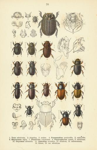 Keywords: Reitter-1908 table70.jpg See image for index to numbers Trox sabulosus <small>Lin </small> Trox sabulosus <small> Linnaeus 1758 </small> 1<sup>a</sup> head of larva 1<sup>b</sup> mandible of larva 1<sup>c</sup> maxilla of larva 1<sup>d</sup> adult dorsal view and size comparison 1<sup>e</sup> head of adult frontal view 1<sup>f</sup> antenna of adult 1<sup>g</sup> labrum of adult 1<sup>h</sup> mandible of adult 1<sup>i</sup> maxilla of adult 1<sup>k</sup> labium of adult dorsal and ventral views Trox hispidus <small>Pontopp </small> Trox hispidus <small>Pontoppidan 1763</small> adult dorsal view Trox scaber <small>Lin </small> Trox scaber <small> Linnaeus 1767 </small> adult dorsal view Psammobius porcicollis <small>Illig </small> Brindalus porcicollis <small> Illiger 1803 </small> adult dorsal view Psammobius sulcicollis <small>Illig </small> Psammodius asper <small> Fabricius 1775 </small> adult dorsal view Rhyssemus asper <small>F </small> Psammodius asper <small> Fabricius 1775 </small> 6<sup>a</sup> adult dorsal view 6<sup>b</sup> maxilla 6<sup>c</sup> labium Diastictus vulneratus <small>Strm </small> Diastictus vulneratus <small> Sturm 1805 </small> adult dorsal view Pleurophorus caesus <small>Panz </small> Pleurophorus caesus <small> Panzer 1796 </small> adult dorsal view Pleurophorus sabulosus <small>Muls </small> Platytomus tibialis <small> Fabricius 1798 </small> adult dorsal view Oxyomus sylvestris <small>Scop </small> Oxyomus sylvestris <small> Scopoli 1763 </small> adult dorsal view Aphodius scrutator <small>Hrbst </small> Aphodius scrutator <small> Herbst 1789 </small> adult dorsal view Aphodius erraticus <small>Lin </small> Aphodius erraticus <small> Linnaeus 1758 </small> adult dorsal view Aphodius subterraneus <small>Lin </small> Aphodius subterraneus <small> Linnaeus 1758 </small> adult dorsal view Aphodius fossor <small>Lin </small> Aphodius fossor <small> Linnaeus 1758 </small> 14<sup>a</sup> adult dorsal view and size comparison 14<sup>b</sup> head frontal view 14<sup>c</sup> antenna 14<sup>d</sup> labrum 14<sup>e</sup> mandible 14<sup>f</sup> maxilla 14<sup>g</sup> labium Aphodius fossor <small>Lin </small> ab silvaticus Aphodius fossor <small> Linnaeus 1758 </small> f silvaticus adult dorsal view Fauna Germanica Die Käfer des deutschen Reiches http //caliban mpiz-koeln mpg de/reitter2/index html vol II pl 70 Farbendrucktafeln von Dr K G Lutz K G Lutz' Verlag Stuttgart creator Edmund Reitter 1908 PD-old Brindalus_porcicollis_-_Reitter jpg Oxyomus_sylvestris_-_Reitter jpg Trox sabulosus Reitter jpg Aphodius erraticus png Reitter - Die Käfer des Deutschen Reichs Coleoptera anatomy Trox sabulosus Trox scaber Psammodius asper Diastictus vulneratus Pleurophorus caesus Aphodiinae Aphodius scrutator Aphodius erraticus Aphodius Aphodius fossor |