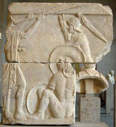 | Keywords: Relief gladiators Glyptothek Munich 364.jpg Reliefplatten mit Darstellung eines Gladiatorkampfes wohl Teil eines Grabmonument 1 Jahrhundert v Chr Zwei Tubabläser verkünden den Sieg im Zweikampf Der Sieger ist zum Schlag bereit und wartet auf das Urteil der Zuschauer die über Leben und Tod des Besiegten entscheiden Relief with a scene of gladiator fight perhaps part of a funerary monument 1st century BC Two trumpet players proclaim the victory of the duel The winner raises his sword and awaits the verdict of the spectators who decide life or death for the loser Relief avec une scène de combat de gladiateur provenant peut-être d'un monument funéraire Ier siècle av J -C Deux joueurs de trompettes proclament la victoire du duel Le vainqueur a l'épée levée et attend le verdict des spectateurs qui doit décider de la vie ou de la mort du vaincu H 107 5 cm Museum Glyptothek Munich Room 11 Saal der römischen Bildnisse object history credit line Purchased in Rome in 1899 from Bissing Collection accession number Inv 364 User Bibi Saint-Pol own work 2007-02-08 other versions Ancient musical instruments Reliefs of gladiators Ancient Roman reliefs in the Glyptothek Munich Glyptothek Munich - Room 11 Bissing Collection 1st-century BC reliefs Ancient Roman reliefs from Italy |