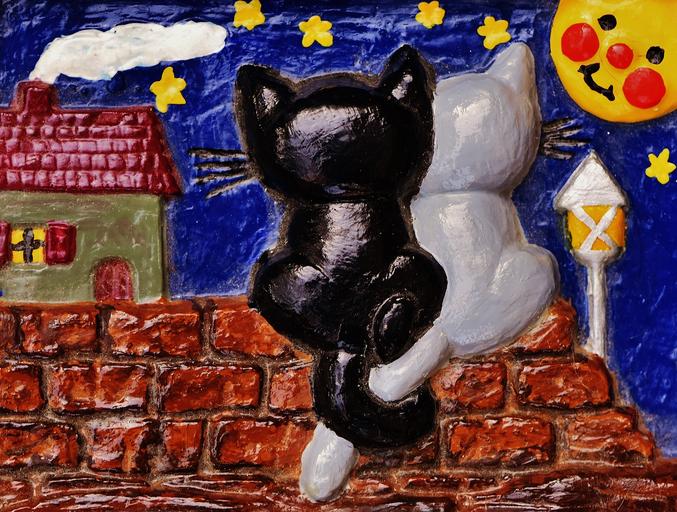 Keywords: relief gypsum hand labor cat moon sit wall cute image pair couple love