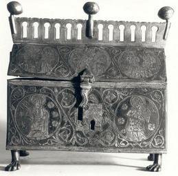 Keywords: Reliquary box.JPG Reliquary box copper enamel gilding Relikwiarz skrzynkowy miedź emalia złocenie cm 8 5 20 5 Catalogue of stolen and missing cultural achievements / comp Jan Świeczyński; Ośrodek Informacyjno-Koordynacyjny Ochrony Obiektów Muzealnych Warsaw 1988 Editor Wojciech Jaskulski Piotr Ogrodzki See also http //www mkidn gov pl/kolekcje/ Department of National Heritage Wartime losses an official webpage of Polish Ministry of Culture Art and National Heritage 14th century; photo made before 1939 Limoges or Catalonia; author of photo unknown PD-Polish Anonymous-EU Goldsmithery lost in Poland during World War II Gothic reliquaries Medieval metalwork Limoges champlevé |