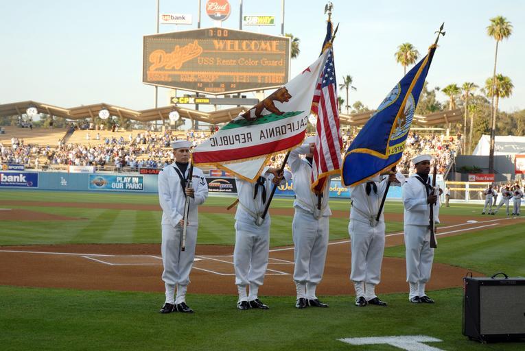 | Keywords: Rentz Color Guard.jpg Color guard from guided-missile frigate USS Rentz FFG 46 parade the colors during the national anthem at the beginning of a Los Angeles Dodgers and Atlanta Braves baseball game at Dodgers Stadium Rentz is visiting Los Angeles in support of Navy Days LA Navy NewsStand photo ID number 070703-N-6536T-019 2007-07-03 Mass Communication Specialist 2nd Class Elizabeth Thompson PD-USGov-Military-Navy USS Rentz FFG-46 | ||||