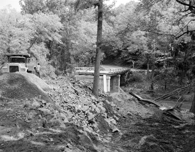 | Keywords: richmond va usa hurricane agnes hurricaneagnes virginia flood flooding natural disaster richmond va usa naturaldisasterrichmondvausa blackandwhite monochrome outdoor black and white Construction crews begin repairing a washed out bridge on Rt. 193 near the intersection with Difficult Run Trail, approximately six miles east of Dranesville in Fairfax County. No. 72-1242, Virginia Governor's Negative Collection, Library of Virginia. Construction crews begin repairing a washed out bridge on Rt. 193 near the intersection with Difficult Run Trail, approximately six miles east of Dranesville in Fairfax County. No. 72-1242, Virginia Governor's Negative Collection, Library of Virginia. |