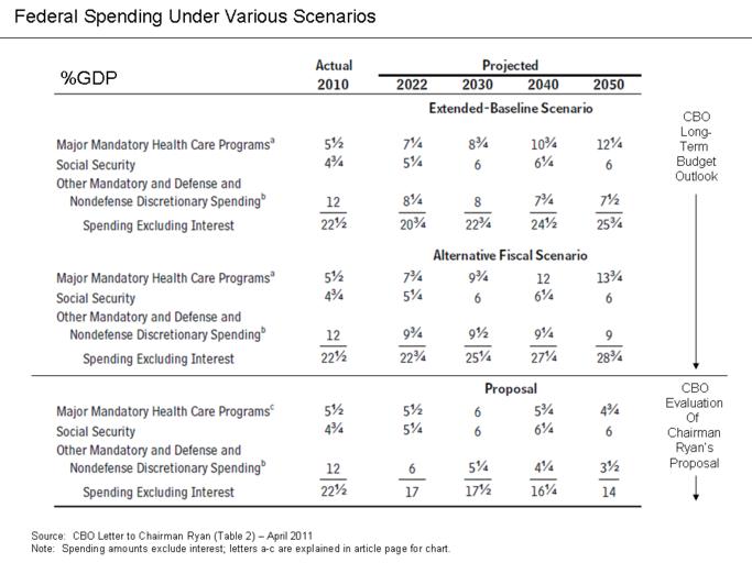 | Keywords: Republican Proposal - Federal Spending as percent GDP.png Federal spending as GDP under CBO and Ryan Scenarios<br/> Understanding the Chart The CBO provided an analysis to Chairman Paul Ryan of the House Committee on the Budget of his budget proposal in April 2011 <ref>http //www cbo gov/ftpdocs/121xx/doc12128/04-05-Ryan_Letter pdf CBO-Ryan Letter-April 2011</ref> The chart captions are listed below excerpted directly from the letter Notes The proposal that CBO analyzed is as specified by Chairman Paul Ryan and his staff The extended-baseline and alternative fiscal scenarios are as described in Congressional Budget Office The Long-Term Budget Outlook June 2010; revised August 2010 Components may not add up to totals because of rounding a Includes Medicare Medicaid exchange subsidies and the Children's Health Insurance Program CHIP b Incorporates collections of premiums paid by Medicare beneficiaries c Includes Medicare and Medicaid as structured under the proposal and CHIP There are no exchange subsidies under the proposal The National Commission on Fiscal Responsibility and Reform separately described the CBO long-term scenarios as listed below The Extended-Baseline Scenario generally assumes continuation of current law The Alternative Fiscal Scenario incorporates several changes to current law considered likely to happen including the renewal of the 2001/2003 tax cuts on income below 250 000 per year continued Alternative Minimum Tax AMT patches the continuation of the estate tax at 2009 levels and continued Medicare Doc Fixes The Alternative Fiscal Scenario also assumes discretionary spending grows with Gross Domestic Product GDP rather than to inflation over the next decade that revenue does not increase as a percent of GDP after 2020 and that certain cost-reducing measures in the health reform legislation are unsuccessful in slowing cost growth after 2020 <ref>http //www fiscalcommission gov/sites/fiscalcommission gov/files/documents/TheMomentofTruth12_1_2010 pdf National Commission on Fiscal Responsibility and Reform-Final Report-December 2010</ref> http //www cbo gov/ftpdocs/121xx/doc12128/04-05-Ryan_Letter pdf CBO-Ryan Letter Farcaster talk 00 26 11 April 2011 UTC Reflist PD-USGov Original upload log en wikipedia Republican+Proposal+-+Federal+Spending+as+percent+GDP png wikitable - 2011-04-11 00 39 960×720× 182269 bytes Farcaster ' - 2011-04-11 00 26 960×720× 182269 bytes Farcaster Federal spending as GDP under CBO and Ryan Scenarios http //www cbo gov/ftpdocs/121xx/doc12128/04-05-Ryan_Letter pdf CBO-Ryan Letter ~~~~~ ~~~~ Permission Uncategorized 2016 May 6 |