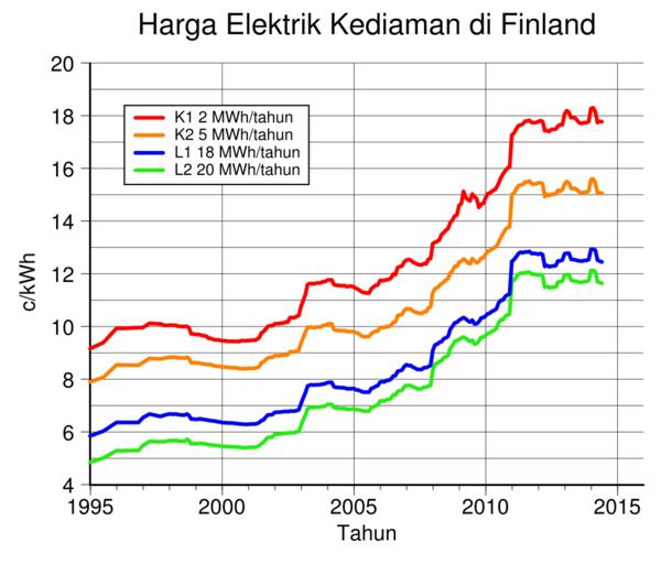 | Keywords: Residential Electricity Price in Finland-ms.svg en Residential electricity price in Finland from 1995 to 2014 Data from http //193 166 171 75/Dialog/varval asp ma 050_ehi_tau_105_en ti Price+of+Electricity+by+Type+of+Consumer 2C+c 2FkWh+ 28Prices+include+electrical+energy 2C+distribution+of+electricity 2C+and+taxes 2E 29 path /Database/StatFin/ene/ehi/ lang 1 multilang en Statistics Finland K1 Apartment house no electric sauna stove consumption 2 000 kWh/a fuse 1x25 A K2 Detached house electric sauna stove no electric heating 5 000 kWh/a 3x25 A L1 Detached house direct electric heating 18 000 kWh/a 3x25 A L2 Detached house partly accumulating electric heating 20 000 kWh/a 3x25 A 2014-11-22 File Residential Electricity Price in Finland-en svg Delphi234 other versions cc-zero Electricity prices Electricity in Finland Uploaded with UploadWizard |