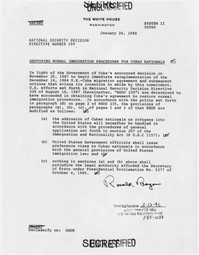 | Keywords: Restoring Normal Immigration Procedures for Cuban Nationals - NARA - 198391.jpg Scope and content General notes 198391 Local identifier President 1981-1989 Reagan National Security Council 1981 - 1989 Ronald Reagan Library NLRR 40 Presidential Drive Simi Valley CA 93065-0600 1988-01-26 Record group Collection RR-NSC Numbered National Security Policy Papers 1981 - 1989 Record group ARC 1189 National Security Decision Directives compiled 02/25/1981 - 01/19/1989 Series ARC 198166 File unit File unit ARC Variant control numbers NAIL Control Number NLS-NSC-NSDD-299 Other versions <gallery> File Restoring_Normal_Immigration_Procedures_for_Cuban_Nationals_-_NARA_-_198391 tif tif File Restoring_Normal_Immigration_Procedures_for_Cuban_Nationals_-_NARA_-_198391 jpg jpg </gallery> NARA-cooperation PD-USGov Presidential Decision Directives Reagan |