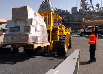Keywords: Resupply DVIDS49170.jpg en Aviation Machinist's Mate 3rd Class Roman Motos a native of St Petersburg Fla directs the loading of stores and equipment into the upper vehicle storage through the starboard side port aboard USS Bonhomme Richard Bonhomme Richard took on supplies and equipment in Bahrain in case U S forces are called upon to assist in humanitarian assistance or disaster relief efforts in areas affected by Cyclone Gonu 2007-06-07 LHD 6 https //www dvidshub net/image/49170 070607-N-+++++-009 2007-07-06 07 32 ABOARD USS BONHOMME RICHARD BH PD-USGov-Military-Navy USS Bonhomme Richard LHD-6 Images from DoD uploaded by Fæ