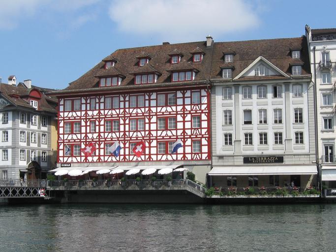 Keywords: reuss river lucerne switzerland swiss bridge shops restaurants la terrazza ristorante europe architecture tourism town sightseeing historical