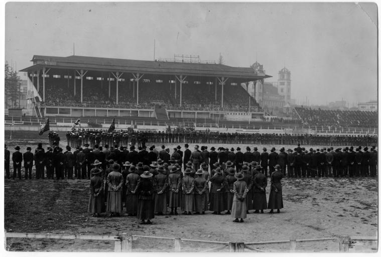 | Keywords: blackandwhite monochrome outdoor black and white Review of female troops at Hastings Park race track VPL 2024 Date: 1915 Photographer/Studio: Thomson, Stuart Topic: Military maneuvers, Stadiums, Women, Military uniforms Organization: Hastings Park Racecourse Location: British Columbia - Vancouver - Hastings-Sunrise - Hastings Community Park More information on our historical photograph collection: www.vpl.ca/historicalphotos Review of female troops at Hastings Park race track VPL 2024 Date: 1915 Photographer/Studio: Thomson, Stuart Topic: Military maneuvers, Stadiums, Women, Military uniforms Organization: Hastings Park Racecourse Location: British Columbia - Vancouver - Hastings-Sunrise - Hastings Community Park More information on our historical photograph collection: www.vpl.ca/historicalphotos |
