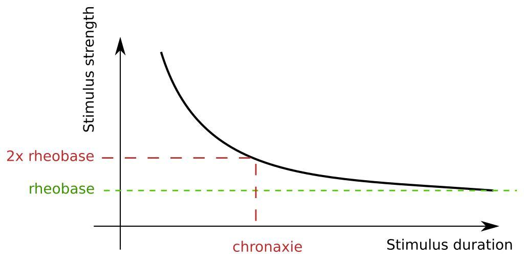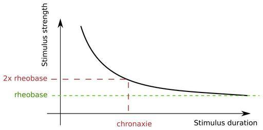 Keywords: Rheobase chronaxie.svg en Chronaxy is the shortest duration of an electrical stimulus where the threshold amplitude is twice the rheobase - the minimum required for eliciting an ACTION POTENTIAL at any time period It is a measure of the excitability of nerve or muscle tissue and is characteristic of types and/or condition of the nerve or muscle cells in the tissue <br /> Rheobase is the minimal current amplitude of indefinite duration practically a few hundred milliseconds that results in the depolarization threshold of the cell membranes being reached i e an action potential or the contraction of a muscle 2012-09-23 22 33 18 own https //commons wikimedia org/wiki/File Rheobase_chronaxie png Sav vas cc-zero Uploaded with UploadWizard Psychiatry Psychology SVG files on nervous system |