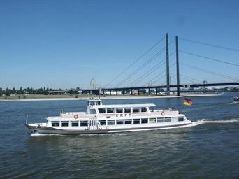 Keywords: rhine river ship amusement ship suspension bridge bridge düsseldorf knee bridge architecture landscape river landscape germany