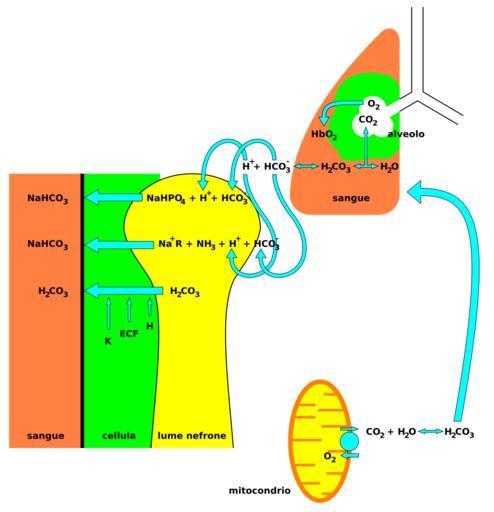 | Keywords: Riassorbimento bicarbonati e respirazione cellulare.svg en This picture shows the oxigen is absorbed by the lung binds to the hemoglobin and then goes to the peripheric cells CO2 transferred from the cells in the image exemplified by a mitochondria il linked to oxigen to form H2CO3 which is in balance with cation H+ and anions HCO3- and then carries out the lung in the image with nefrone are not showing the exact stachiometrich formulas of reabsorption of NaHPO4 and NH3 still present in the text This is due to not complicate too the picture it La seguente immagine mostra l'O2 viene assorbito dai polmoni si lega all'emoglobina Hb e da qui viene trasportata ai tessuti la CO2 ceduta dai tessuti nella immagine esemplificata da un mitocondrio viene idratata in bicarbonato H2CO3 che mantiene un equilibrio con i cationi H+ e gli anioni HCO3- e con questo carrier escreta poi nei polmoni nella immagine riguardante il nefrone per non complicarla troppo non sono visualizzati le esatte formule stechiometriche del riassorbimento del NaHPO4 e del NH3 presenti comunque nel testo Riassorbimento_bicarbonati_e_respirazione_cellulare jpg 2010-01-29 13 30 UTC Riassorbimento_bicarbonati_e_respirazione_cellulare jpg Gianreali derivative work Luigi Chiesa <span class signature-talk >talk</span> Medical diagrams Physiology Urinary system |