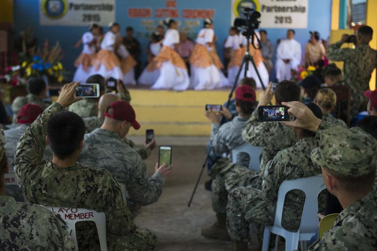 Keywords: Ribbon cutting ceremony at Basiao Elementary School in the Philippines during Pacific Partnership 2015 150801-N-UQ938-209.jpg en BASIAO Philippines Aug 1 2015 U S Navy Seabees and U S Air Force RED HORSE engineers from the hospital ship USNS Mercy T-AH 19 record a dance performance by students at Basiao Elementary School The engineers spent two weeks with the students while rebuilding parts of the school that had been damaged in Hurricane Yolanda Mercy is in the Philippines for its third mission port of Pacific Partnership 2015 Pacific Partnership is in its 10th iteration and is the largest annual multilateral humanitarian assistance and disaster relief preparedness mission conducted in the Indo-Asia-Pacific region While training for crisis conditions Pacific Partnership missions to date have provided real world medical care to approximately 270 000 patients and veterinary services to more than 38 000 animals Critical infrastructure development has been supported in host nations during more than 180 engineering projects U S Navy photo by Mass Communication Specialist 1st Class Trevor Andersen/RELEASED <br>Unit Navy Public Affairs Support Element West 2015-08-01 Petty Officer 1st Class trevor andersen https //www dvidshub net/image/2099765/ribbon-cutting-ceremony-basiao-elementary-school-philippines-during-pacific-partnership-2015 150801-N-UQ938-209 2015-08-01 17 42 BASIAO PH PD-USGov-Military-Navy USNS Mercy T-AH-19 Pacific Partnership 2015 United States Navy Seabees Images from DoD uploaded by Fæ