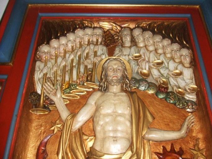 Keywords: Riedlingen Neufra Pfarrkirche Altar detail 1.jpg Pfarrkirche St Peter und Paul Neufra an der Donau Stadt Riedlingen <br /> Jugendstilalatar in der Krypta gefertigt nach Entwürfen von Prof Karl Rieber durch Bildhauer Gabriel Lämmle own own photograph 2009 Photo Veit Feger Written permission by the author Veit Feger to license as Public Domain Veit Feger Pfarrkirche St Peter und Paul Neufra Gabriel Lämmle Book of Revelation |