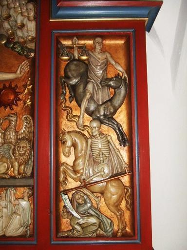 Keywords: Riedlingen Neufra Pfarrkirche Altar detail 3.jpg Pfarrkirche St Peter und Paul Neufra an der Donau Stadt Riedlingen <br /> Jugendstilalatar in der Krypta gefertigt nach Entwürfen von Prof Karl Rieber durch Bildhauer Gabriel Lämmle; rechter Seitenflügel own own photograph 2009 Photo Veit Feger Written permission by the author Veit Feger to license as Public Domain Veit Feger Pfarrkirche St Peter und Paul Neufra Gabriel Lämmle Four Horsemen of the Apocalypse |