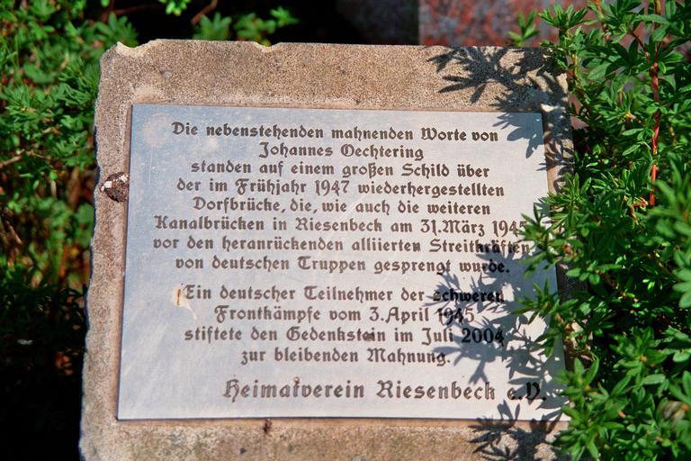 | Keywords: Riesenbeck Gedenkstein Dorfbruecke 02.jpg en Information plaque beside the memorial stone in Hörstel-Riesenbeck Kreis Steinfurt North Rhine-Westphalia Germany de Erläuterungsplakette zum Gedenkstein an der Dorfbrücke in Hörstel-Riesenbeck Kreis Steinfurt Nordrhein-Westfalen Deutschland Der Stein mit einem Text von Johannes Oechtering mahnt zum Frieden und prangert den Irrsinn des Krieges an own J -H Janßen 2011-06 FoP-Germany Riesenbeck Memorial stones in Hörstel Riesenbeck Plaques in Hörstel Riesenbeck 2011 in Hörstel 201106 Horstel-Riesenbeck June 2011 in Germany 201106 Horstel-Riesenbeck Bilder von J -H Janßen Cc-zero |