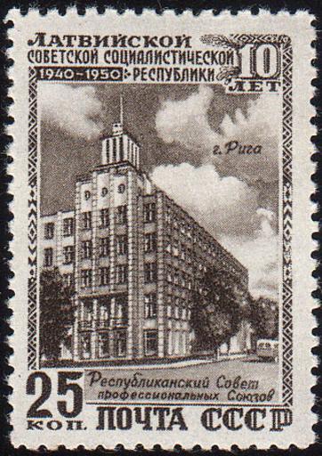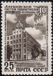 | Keywords: Riga 1950 25kop USSR.jpg en Postage stamp issued by the Soviet Union 1950 depicting view of Riga Latvia Bruninieku street 29-31 Architect Ernest Stalberg Project - 1927 The project was implemented only partially It was built in 1930-31 by the German architects Alfred Karr and Kurt Betge Scan of postage stamp from own collection Philaweb 2009-11-14 PD-RU-exempt stamps Stamps of the Soviet Union 1950 Riga on stamps Latvian Soviet Socialist Republic Bruninieku street „– 29/31 | ||||