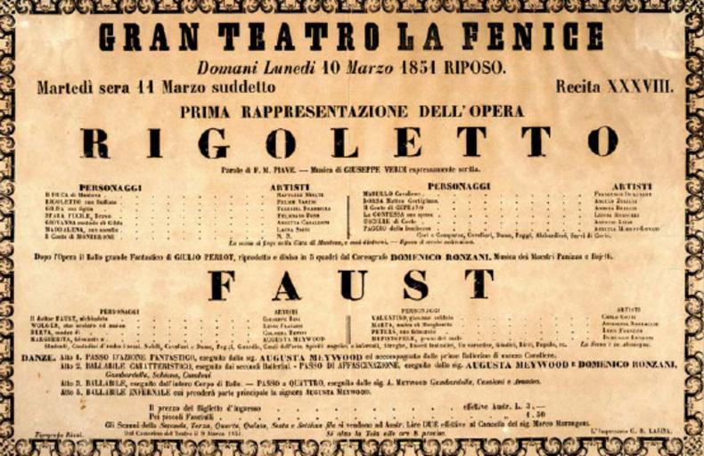 Keywords: Rigoletto premiere poster.jpg en Poster for the world premiere of Verdi's opera Rigoletto 11 March 1851 1851 http //www teatrolafenice it/public/libretti/63_1269LibrettoRigoletto pdf p 20 Teatro La Fenice PD-old-100 Uploaded with UploadWizard Rigoletto La Fenice Category Giuseppe Verdi |