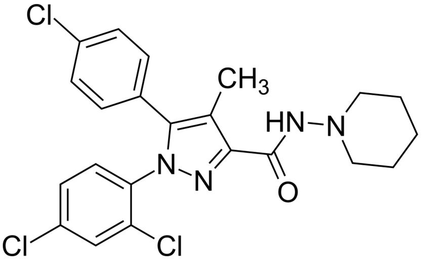 | Keywords: Rimonabant 200.svg validSVG Structure of 5- 4-chlorophenyl -1- 2 4-dichlorophenyl -4-methyl-N- piperidin-1-yl -1H-pyrazole-3-carboxamide Own 2014-04-18 Emeldir <span class signature-talk >talk</span> Chemical structure verified https //upload wikimedia org/wikipedia/commons/1/19/Rimonabant_200 svg 1S/C22H21Cl3N4O/c1-14-20 22 30 27-28-11-3-2-4-12-28 26-29 19-10-9-17 24 13-18 19 25 21 14 15-5-7-16 23 8-6-15/h5-10 13H 2-4 11-12H2 1H3 H 27 30 JZCPYUJPEARBJL-UHFFFAOYSA-N 168273-06-1 Synonyms <small>5- 4-Chloro-phenyl -1- 2 4-dichloro-phenyl -4-methyl-1H-pyrazole-3-carboxylic acid piperidin-1-ylamide HCl 5- 4-Chlorophenyl -1- 2 4-dichlorophenyl -4-methyl-N- 1-piperidinyl -1H-pyrazole-3-carboxylic acid amide 5- p-Chlorophenyl -1- 2 4-dichlorophenyl -4-methyl-N-piperidinopyrazole-3-carboxamide Acomplia Rimocaban Rimonabant SR 141716 SR 141716A SR-141716 Zimulti</small> PD-chem Rimonabant |
