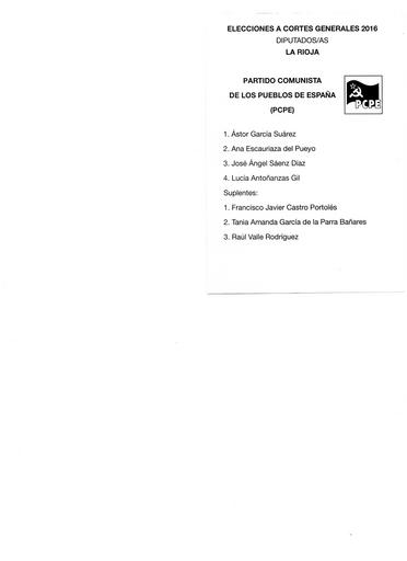 | Keywords: Rioja pcpe generales 2016.jpg es Papeleta electoral de Partido Comunista de los Pueblos de España PCPE para el Congreso - Elecciones Generales de España de 2016 circunscripción de La Rioja 2016-08-05 own B25es other versions cc-zero PD-SpanishGov <br/> De minimis The party logo Ballot papers for the 2016 general election for La Rioja Spain Ballot papers for Partido Comunista de los Pueblos de España Uploaded via Campaign bpsge | ||||