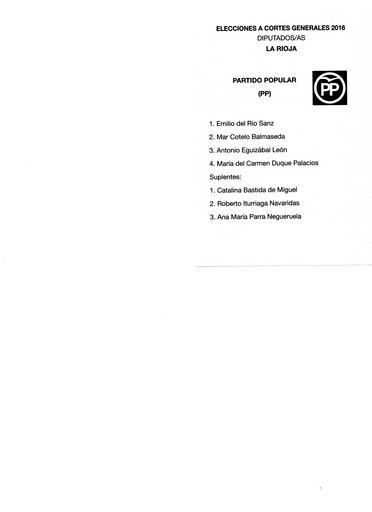 | Keywords: Rioja pp generales 2016.jpg  es Papeleta electoral de Partido Popular PP para el Congreso - Elecciones Generales de España de 2016 circunscripción de La Rioja 2016-08-05 own B25es other versions cc-zero PD-SpanishGov <br/> De minimis The party logo Ballot papers for the 2016 general election for La Rioja Spain Ballot papers for Partido Popular Uploaded via Campaign bpsge |