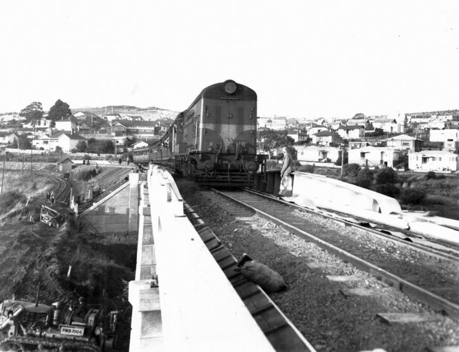 Keywords: train railway tasmania blackandwhite monochrome outdoor vehicle black and white X26 heads a works train from the zinc smelter to Derwent Park over the newly completed Brooker Highway overbridge. The bridge spans were apparently recycled from the Bridgewater swing span bridge recently replaced by the new lift span bridge. Probably a PWD official photo X26 heads a works train from the zinc smelter to Derwent Park over the newly completed Brooker Highway overbridge. The bridge spans were apparently recycled from the Bridgewater swing span bridge recently replaced by the new lift span bridge. Probably a PWD official photo |