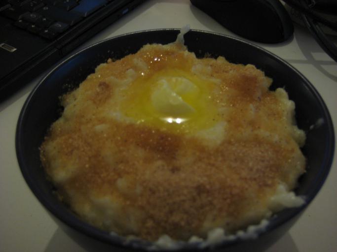 MAKE A MEME View Large Image Risengroed.jpg Bowl of rice pudding Rice pudding boiled on milk and served with a knob of butter and a sprinkle-mix of sugar and powdered cinnamon is a traditional Christmas food in Denmark The dish is called 'Risengrød' in Danish ...