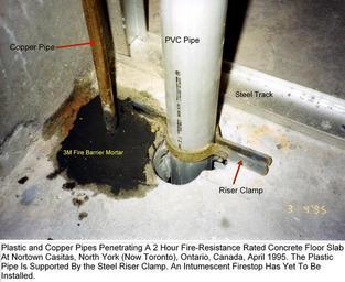 Keywords: Riser clamp.jpg Riser Clamp Holding Plastic Pipe Penetrating Through Concrete Floor Slab The Copper Pipe Penetration Is Firestopped With Firestop Mortar Own 2007-08-22 Achim Hering Riser clamps Cement Plumbing Operable firestops Copper pipes 3M Fire Barrier Mortar |