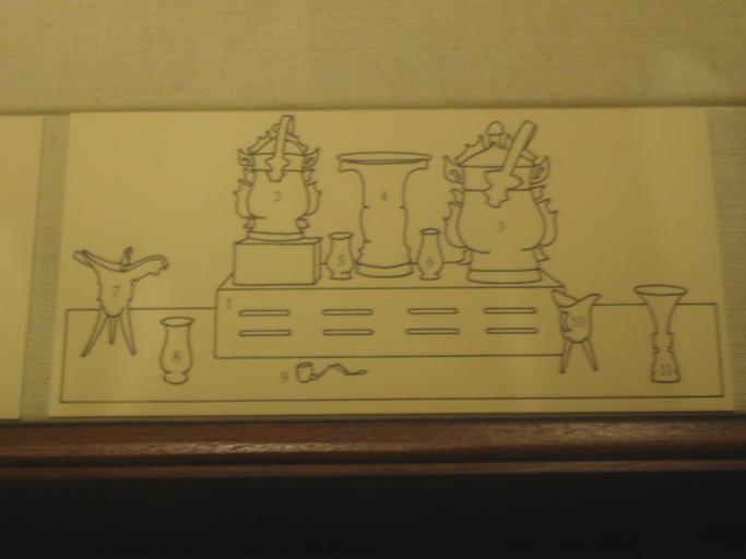 Keywords: Ritual alter set, bronze, description 4.JPG Numbered diagram for a Western Zhou Dynasty bronzeware ritual set from the Metropolitan Museum of Art New York 1 Ritual alter table <br> 2 Ritual wine container with lid and pedestal <br> 3 Ritual wine container with lid <br> 4 Ritual wine container <br> 5 Ritual wine cup <br> 6 Ritual wine cup <br> 7 Ritual wine vessel <br> 8 Ritual wine cup <br> 9 Ritual ladle <br> 10 Ritual wine vessel <br> 11 Ritual wine beaker <br> 12 Spouted ritual water vessel with attached lid <br> 13 Ritual wine cup <br> 14 Ritual wine container <br> Metropolitan Museum of Art New York City 2008-06-24 User PericlesofAthens Zhou Dynasty |