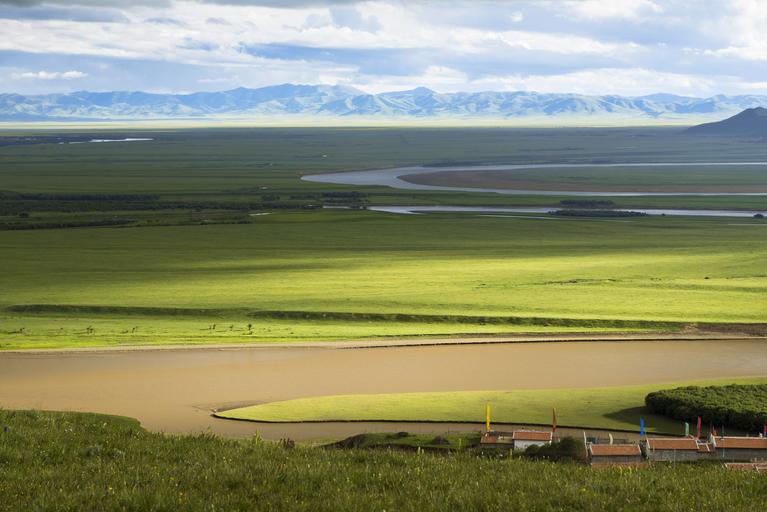 Keywords: river grassland prairie landscape nature sky grass scenic water green natural outdoor summer mountain rain yellow river zoige blue summer landscape nature landscape
