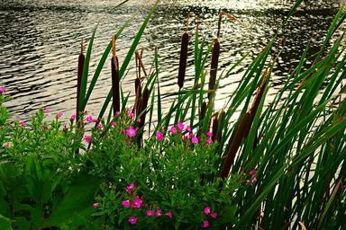 Keywords: river riverbank rushes reeds vegetation water's edge water sunlight on water