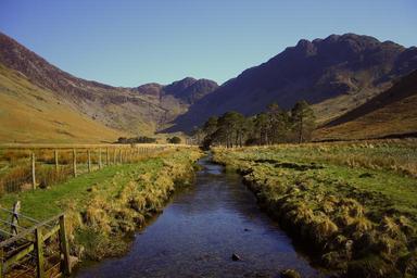 Keywords: river stream creek rural straight water fresh nature landscape outdoor mountain fences pasture countryside farmland grass valley