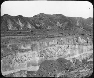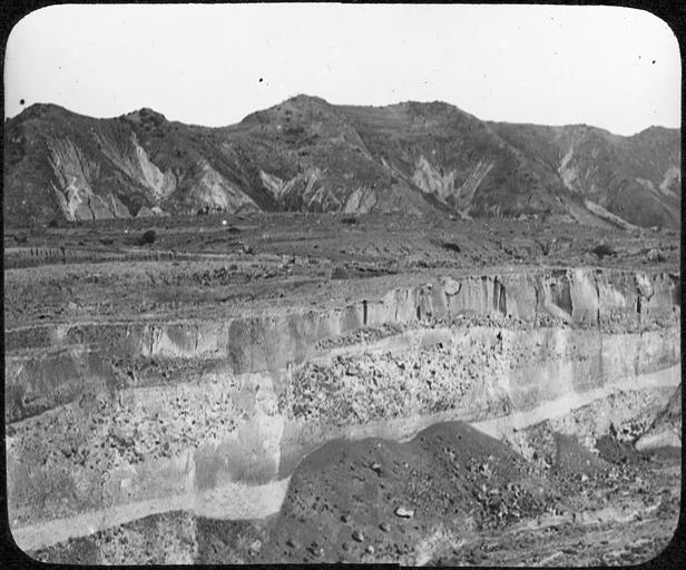 Keywords: Riviere Blanche YORYM-TA0315.jpg One slide and one negative Gorge cut in thick ash deposits of 1902 eruption The top of the ash deposits is almost level Several ash units are present in the walls of the gorge - some relatively fine-grained and others with concentrations of large blocks They may represent ash flows and/or mud flows Screes have formed at the base of the cliffs Some vegetation on the hills in the background depicted people depicted place Rivière Blanche Martinique 1907 Black and White glass Lantern slide Institution Yorkshire Museum Natural History object history exhibition history credit line Yorkshire Museum York Museums Trust accession number YORYM TA315 The Tempest Anderson Photographic Archive held at York Museums Trust <br> York Museums Trust image PD-old-100 PD-US Uploaded with UploadWizard Images from the Tempest Anderson Collection vulcanology 1902 eruption of Mount Pelée Volcanic ash 1907 photographs |