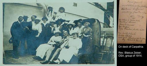 Keywords: Rms carpathia passengers on deck 1914 blasius zeiser osa group of 1914.JPG en Rare on-deck image of passengers on <i>RMS Carpathia</i> during a 1914 overseas tour led by Father Blasius Zeiser OSA <i>Carpathia</I> rescued the <i>Titanic</i> disaster survivors in 1912 The <i>Titanic</i>-rescue-voyage's captain's last year of service was 1914 <i>Carpathia</i> was sunk in 1918 during World War One The steamer passengers pictured include adults children and an infant who sit in deck chairs or stand One empty deck chair is visible In the distance above the group is a densely-packed crowd on a higher-up deck or perhaps touring the wing bridge user CramYourSpam RMS Carpathia official photographer 1914 PD-OLD PD-old Deckchairs Carpathia ship 1903 Order of Saint Augustine Religious organizations established in the 13th century Ship passengers |