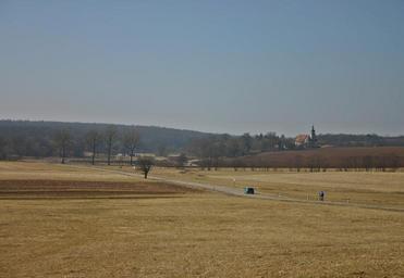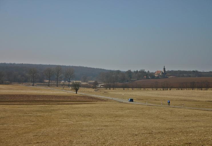 Keywords: road rural landscape traffic field church steeple arable auto cyclists wide view building moors ehningen baden württemberg germany southern germany grass meadow village