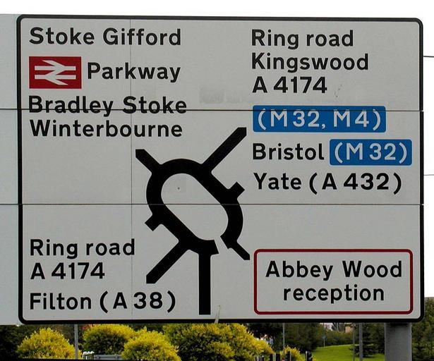 Keywords: Road.sign.arp.750pix.jpg A road sign near Bristol England The direction sign is patched according to the Guildford Rules It gives directions to Bristol Parkway railway station red British Rail symbol motorways blue-background patches and towns reached via non-primary A-roads Red-edged patches and red-bordered signs are used for military establishments the Ministry of Defence at Abbey Wood in this example Destinations which are reached indirectly have the corresponding road number in brackets; for instance this sign says that Filton is reached by following the A4174 ring road to the A38 and then turning onto the A38 for Filton Taken by Adrian Pingstone in October 2004 and released to the public domain 2004-10 User Arpingstone on http //en wikipedia org en wikipedia page is was here <nowiki> 19 06 8 October 2004 Arpingstone 750×624 110 953 bytes <span class comment > Road Sign </span> </nowiki> Road signs in England