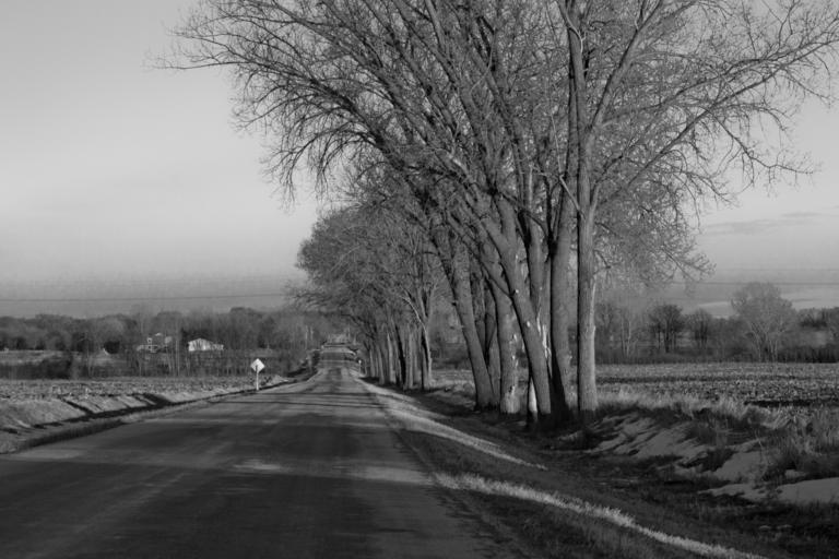 Keywords: road trees roadside outdoor countryside view scenic black and white
