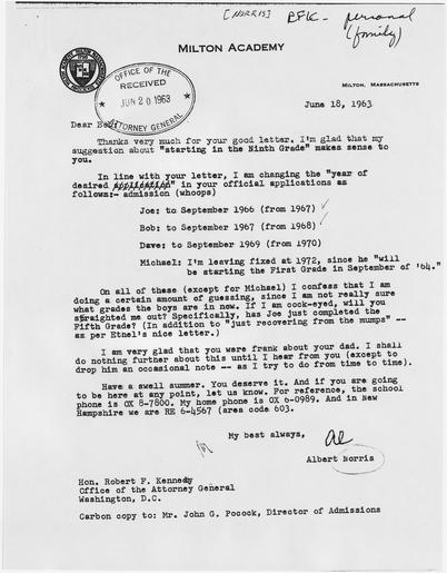 | Keywords: Robert F. Kennedy's Children Schooling - NARA - 193961.tif Scope and content Letter from Milton Academy concerning future enrollment of Robert F Kennedy's children General notes 193961 Local identifier Kennedy Robert F Robert Francis 1925-1968 John F Kennedy Library NLJFK Columbia Point Boston MA 02125-3398 1963-06-18 Record group Collection JFK-RFK Robert F Kennedy Papers 1937 - 06/06/1968 Record group ARC 1169 Robert F Kennedy Papers Attorney General Papers Personal Correspondence compiled 1960 - 1964 Series ARC 193954 File unit Robert F Kennedy Papers Attorney General's Files Personal Correspondence Family 1963 03/28/1963 - 12/31/1963 File unit ARC 193959 Variant control numbers NAIL Control Number NLK-RFK-AGFILESPERCO-FAMILY1963-7BB yes Other versions <gallery> File Robert_F _Kennedy's_Children_Schooling_-_NARA_-_193961 tif tif File Robert_F _Kennedy's_Children_Schooling_-_NARA_-_193961 jpg jpg </gallery> NARA-cooperation PD-USGov Robert F Kennedy Letters written messages NARA TIF images with categorized JPGs |