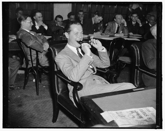 Keywords: Robert Montgomery 1939.tif Robert Montgomery before senate committee Washington D C April 3 The S R O sign was hung out today at the Senate Interstate Commerce Committee Hearing as Robert Montgomery movie star appeared to express his opposition to a bill designed to prohibit Block booking and Blind selling two trade practices which curb the discretion that a movie house owner has in selecting pictures to be shown in his community Speaking as a former President of the Screen Actors Guild Montgomery told the Committee that the Guild and their lawyers have come to the very definite conclusion that if the bill should become a law it would cut in half the production schedules of the Motion Picture Industry 4-3- 39 LOC-image hec 26407 Harris Ewing 1939-04-03 PD-Harris-Ewing File Robert_Montgomery_1939_cropped jpg PD-Harris-Ewing Robert Montgomery Men facing right and looking right |