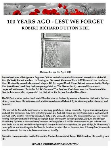 | Keywords: text 100 YEARS AGO - LEST WE FORGET - ROBERT RICHARD DUTTON KEEL Robert Keel was a refrigerator Engineer Officer in the Mercantile Marine and served aboard the SS Zent (Belfast). Robert was born in Burrington, Somerset, the son of Francis William and the late Sarah Keel. The family owned a house and shop at 101 Liverpool Road, Irlam. Robert was married to Gladys Keel (nee Garner) and they had two young children. The Garner family were well known and respected in the area. Her late father Mr. W. Garner of the Beeches, Cadishead was the Guardian of the Poor in Irlam and also represented the district on the Barton Board of Guardians. The SS Zent was torpedoed and sunk 28 miles west of Fastnet by enemy submarine U66, with the loss of forty nine lives. His wife received a letter from Messrs Elders & Fyffe attesting to his character and heroism: 'The news of the loss of the Zest came to us as a very great shock, but we realise that to you, who have lost your husband, the shock must have been infinitely greater. Mr Keel had been in our employ for quite a long time and was held in the greatest respect by everybody, both in the firm and outside. The firm has lost an engineer whose sterling character and ability were of the highest. From information we have gathered, Mr Keel was last seen distributing life belts to the members of the crew, and we feel sure it will be some comfort to you to know that even in the end he was unselfish and gave his best for the assistance of others. He gave his life for his country's cause quite as much as though he had been in the sister service. But, at the same time, it is very hard to reconcile ourselves even to this when the loss comes home so terribly.' Robert is commemorated on the Mercantile Marine Memorial at Tower Hill, London. He was 31 years old. IRLAM & CADISHEAD WW ASSOCIATION. 100 YEARS AGO - LEST WE FORGET - ROBERT RICHARD DUTTON KEEL Robert Keel was a refrigerator Engineer Officer in the Mercantile Marine and served aboard the SS Zent (Belfast). Robert was born in Burrington, Somerset, the son of Francis William and the late Sarah Keel. The family owned a house and shop at 101 Liverpool Road, Irlam. Robert was married to Gladys Keel (nee Garner) and they had two young children. The Garner family were well known and respected in the area. Her late father Mr. W. Garner of the Beeches, Cadishead was the Guardian of the Poor in Irlam and also represented the district on the Barton Board of Guardians. The SS Zent was torpedoed and sunk 28 miles west of Fastnet by enemy submarine U66, with the loss of forty nine lives. His wife received a letter from Messrs Elders & Fyffe attesting to his character and heroism: 'The news of the loss of the Zest came to us as a very great shock, but we realise that to you, who have lost your husband, the shock must have been infinitely greater. Mr Keel had been in our employ for quite a long time and was held in the greatest respect by everybody, both in the firm and outside. The firm has lost an engineer whose sterling character and ability were of the highest. From information we have gathered, Mr Keel was last seen distributing life belts to the members of the crew, and we feel sure it will be some comfort to you to know that even in the end he was unselfish and gave his best for the assistance of others. He gave his life for his country's cause quite as much as though he had been in the sister service. But, at the same time, it is very hard to reconcile ourselves even to this when the loss comes home so terribly.' Robert is commemorated on the Mercantile Marine Memorial at Tower Hill, London. He was 31 years old. IRLAM & CADISHEAD WW ASSOCIATION. |
