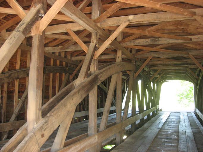 | Keywords: Roberts Covered Bridge, interior trusses.jpg 39 44 25 6 N 84 38 19 W Overview of the Burr arch truss inside the w Roberts Covered Bridge which spans Seven Mile Creek off Beech Street in Eaton Ohio Eaton Ohio United States Built in 1829 it is Ohio's last remaining double-barrelled covered bridge; in 1991 it was moved from its original location 3 miles south of Eaton to its present site The bridge is listed on the National Register of Historic Places Own 2010-08-16 User Nyttend Nyttend Roberts Covered Bridge Building-centered pictures by User Nyttend Taken with Canon PowerShot A540 |