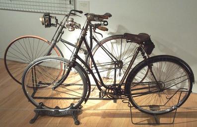 Keywords: RobertsIvelSateyCycles.JPG en A Roberts safety bicycle rear made in 1889 and originally owned by Mr G A Geary and an Ivel safety bicycle front made in 1886 Both machines on display at Bedford Museum's Clocking In exhibition at the Bedford Gallery own Simon Speed 2010-04-01 Clocking In Exhibition Bedford Museum Vintage bicycles Photos by Simon Speed |