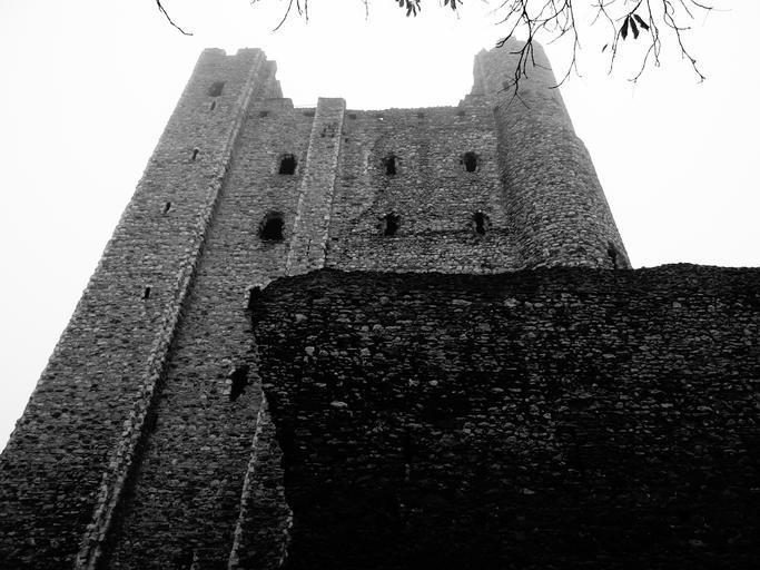 | Keywords: blackandwhite monochrome outdoor black and white Rochester Castle stands on the east bank of the River Medway in Rochester, Kent, South East England. The 12th-century keep or stone tower, which is the castle's most prominent feature, is one of the best preserved in England or France. Situated on the River Medway and Watling Street, Rochester served as a strategically important royal castle. During the late medieval period it helped protect England's south-east coast from invasion. The first castle at Rochester was founded in the aftermath of the Norman Conquest. It was given to Bishop Odo, probably by his half-brother William the Conqueror. During the Rebellion of 1088 over the succession to the English throne , Odo supported Robert Curthose, the Conqueror's eldest son, against William Rufus. It was during this conflict that the castle first saw military action; the city and castle were besieged after Odo made Rochester a headquarters for the rebellion. After the garrison capitulated, this first castle was abandoned. Between 1087 and 1089, Rufus asked Gundulf, Bishop of Rochester, to build a new stone castle at Rochester. He established the current extent of the castle. Though much altered through the centuries, some parts of Gundulf's work survive. In 1127 King Henry I granted the castle to the Bishops of Canterbury in perpetuity. William de Corbeil built the massive keep that still dominates the castle today. Throughout the 12th century the castle remained in the custody of the archbishops. During the First Barons' War (1215–1217) in King John's reign, baronial forces captured the castle from Archbishop Stephen Langton and held it against the king, who then besieged it. The Barnwell chronicler remarked "Our age has not known a siege so hard pressed nor so strongly resisted". After resisting for just over seven weeks, the garrison surrendered. Although the castle had been greatly damaged, with breaches in the outer walls and one corner of the keep collapsed, it was hunger that eventually forced the defenders' hand. The castle did not stay under John's control for long: in 1216 it was captured by the French Prince Louis, who was the new leader of the baronial faction. John died and was succeeded by his son King Henry III in 1216; the next year, the war ended and the castle was taken under direct royal control. Rochester was besieged for the third time in 1264 during the Second Barons' War (1264–1267). The castle's royal constable, Roger de Leybourne, held Rochester in support of Henry III. Rebel armies led by Simon de Montfort and Gilbert de Clare entered the city and set about trying to capture the castle. Again the castle's defenders resisted, though this time with a different outcome. After a week, the rebel armies raised the siege in the face of relief from Henry himself. Although the garrison did not surrender, the castle suffered extensive damage that was not repaired until the following century. The castle saw military action for the last time in 1381 when it was captured and ransacked during the Peasants' Revolt. As Rochester Castle fell out of use its materials were reused elsewhere and custodianship relinquished by the Crown. The castle and its grounds were opened to the public in the 1870s as a park. At various points during the 19th and 20th centuries repairs were carried out. The castle is protected as a Grade I listed building and Scheduled Monument. Today the ruins are in the guardianship of English Heritage and open to the public. Rochester Castle stands on the east bank of the River Medway in Rochester, Kent, South East England. The 12th-century keep or stone tower, which is the castle's most prominent feature, is one of the best preserved in England or France. Situated on the River Medway and Watling Street, Rochester served as a strategically important royal castle. During the late medieval period it helped protect England's south-east coast from invasion. The first castle at Rochester was founded in the aftermath of the Norman Conquest. It was given to Bishop Odo, probably by his half-brother William the Conqueror. During the Rebellion of 1088 over the succession to the English throne , Odo supported Robert Curthose, the Conqueror's eldest son, against William Rufus. It was during this conflict that the castle first saw military action; the city and castle were besieged after Odo made Rochester a headquarters for the rebellion. After the garrison capitulated, this first castle was abandoned. Between 1087 and 1089, Rufus asked Gundulf, Bishop of Rochester, to build a new stone castle at Rochester. He established the current extent of the castle. Though much altered through the centuries, some parts of Gundulf's work survive. In 1127 King Henry I granted the castle to the Bishops of Canterbury in perpetuity. William de Corbeil built the massive keep that still dominates the castle today. Throughout the 12th century the castle remained in the custody of the archbishops. During the First Barons' War (1215–1217) in King John's reign, baronial forces captured the castle from Archbishop Stephen Langton and held it against the king, who then besieged it. The Barnwell chronicler remarked "Our age has not known a siege so hard pressed nor so strongly resisted". After resisting for just over seven weeks, the garrison surrendered. Although the castle had been greatly damaged, with breaches in the outer walls and one corner of the keep collapsed, it was hunger that eventually forced the defenders' hand. The castle did not stay under John's control for long: in 1216 it was captured by the French Prince Louis, who was the new leader of the baronial faction. John died and was succeeded by his son King Henry III in 1216; the next year, the war ended and the castle was taken under direct royal control. Rochester was besieged for the third time in 1264 during the Second Barons' War (1264–1267). The castle's royal constable, Roger de Leybourne, held Rochester in suppo