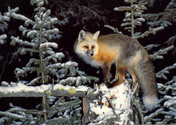 Keywords: Rocky Mountain Red Fox standing on Fallen Tree trees winter snow animal unitedstates wildlife fox usforestservice naturalresources rockymountainredfox