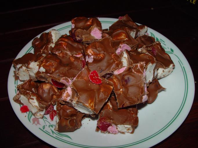 MAKE A MEME View Large Image Rocky Road dessert.jpg en <br/> Image title Plate with Rocky Road style dessert Cherries with pink and white nougat covered in chocolate Image from Public domain images website http //www public-domain-image com/full-image/...