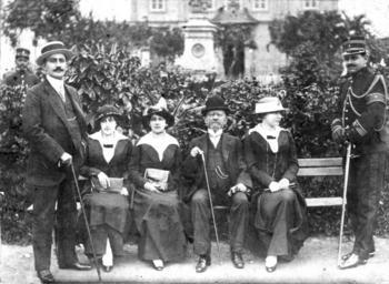 | Keywords: Rodrigues Alves e família em Aparecida.jpg  Conselheiro Rodrigues Alves presidente do Brasil de 1902 a 1906 e família na antiga igreja de Aparecida em 1913 <br/> Legenda Da esquerda para a direita Oscar Rodrigues Alves Isabel Rodrigues Alves Maria Rodrigues Alves Conselheiro Francisco de Paula Rodrigues Alves Zaïra Rodrigues Alves e capitão Eduardo Lejeune ajudante de ordens Acervo da família Rodrigues Alves 1913 author PD-BR-1937 Rodrigues Alves People of Aparecida Files by User Dantadd Families of Brazil Fashion in 1913 1913 in Brazil Military people in the 20th century Military people of Brazil Three-piece suits |