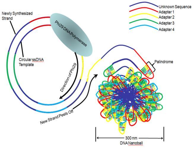 | Keywords: Rolling Circle Replication To Create DNA Nanoball.png en Phi29 DNA Polymerase copies the circular template DNA It displaces the newly synthesized strand as it replicates The newly synthesized strand forms a ball due to the palindromic sequences in the adapter fragments The completed DNA nanoball is 300nm wide and is ready to be adsorbed onto a flow cell own Suspencewl Cc-zero DNA Biology diagrams Diagrams in English | ||||