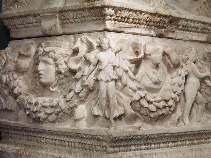 | Keywords: Roman - Garland Sarcophagus - Walters 2329 - Detail D.jpg Unlike many sarcophagi this one is carved on all four sides in high relief Garlands held by winged goddesses or personifications on the corners and Eros Cupid figures on the sides support the busts of a crowned deity left and a young girl right The sarcophagus was probably intended for her In the center on both the front and back is a theatrical mask-on this side Tragedy on the other Comedy Medusa heads decorate the ends The lid takes the form of a temple roof with a pediment triangular gable at each end This sarcophagus can be traced to a particular workshop active near the ancient quarry of Dokimeion in Phrygia in Asia Minor Its discovery in Rome illustrates the long-distance trade in even very large heavy luxury goods that took place at the height of the Roman Empire between 150 180 Imperial Dokimeion marble cm 83 5 143 35 69 85 accession number 23 29 30186 Excavated from the so-called Licinian tomb Rome 1885 Don Marcello Massarenti Collection Rome 1885 by excavation Henry Walters city Baltimore Walters Art Museum Henry Walters Acquired by Henry Walters with the Massarenti Collection 1902 Treasures of Heaven The Cleveland Museum of Art Cleveland; The Walters Art Museum Baltimore; The British Museum London 2010-2011 place of origin Phrygia in present-day Turkey Walters Art Museum license Ancient Roman art in the Walters Art Museum Media contributed by the Walters Art Museum needs category review |