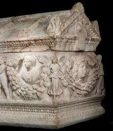 | Keywords: Roman - Garland Sarcophagus - Walters 2329 - Detail F.jpg Unlike many sarcophagi this one is carved on all four sides in high relief Garlands held by winged goddesses or personifications on the corners and Eros Cupid figures on the sides support the busts of a crowned deity left and a young girl right The sarcophagus was probably intended for her In the center on both the front and back is a theatrical mask-on this side Tragedy on the other Comedy Medusa heads decorate the ends The lid takes the form of a temple roof with a pediment triangular gable at each end This sarcophagus can be traced to a particular workshop active near the ancient quarry of Dokimeion in Phrygia in Asia Minor Its discovery in Rome illustrates the long-distance trade in even very large heavy luxury goods that took place at the height of the Roman Empire between 150 180 Imperial Dokimeion marble cm 83 5 143 35 69 85 accession number 23 29 30186 Excavated from the so-called Licinian tomb Rome 1885 Don Marcello Massarenti Collection Rome 1885 by excavation Henry Walters city Baltimore Walters Art Museum Henry Walters Acquired by Henry Walters with the Massarenti Collection 1902 Treasures of Heaven The Cleveland Museum of Art Cleveland; The Walters Art Museum Baltimore; The British Museum London 2010-2011 place of origin Phrygia in present-day Turkey Walters Art Museum license Ancient Roman art in the Walters Art Museum Media contributed by the Walters Art Museum needs category review |