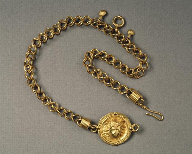 Keywords: Roman - Necklace with Head of Helios or Medusa - Walters 57516.jpg This necklace is composed of coarse chain link and a repoussé disc century 2 AD gold as photographed 15 1/8 x 1 15/16 x 5/16 x 7 5/16 in 38 4 x 5 x 0 87 x 18 6 cm h x w x d x l ; width at clasp cm 2 7 accession number 57 516 35425 Dikran Kelekian New York and Paris date and mode of acquisition unknown Henry Walters Baltimore date of acquisition unknown by purchase Walters Art Museum Henry Walters Acquired by Henry Walters Jewelry - Ancient to Modern The Walters Art Gallery Baltimore 1979-1980 place of origin Egypt Walters Art Museum license Ancient Roman art in the Walters Art Museum Art of Roman Egypt in the Walters Art Museum Jewellery in the Walters Art Museum Ancient Roman necklaces |